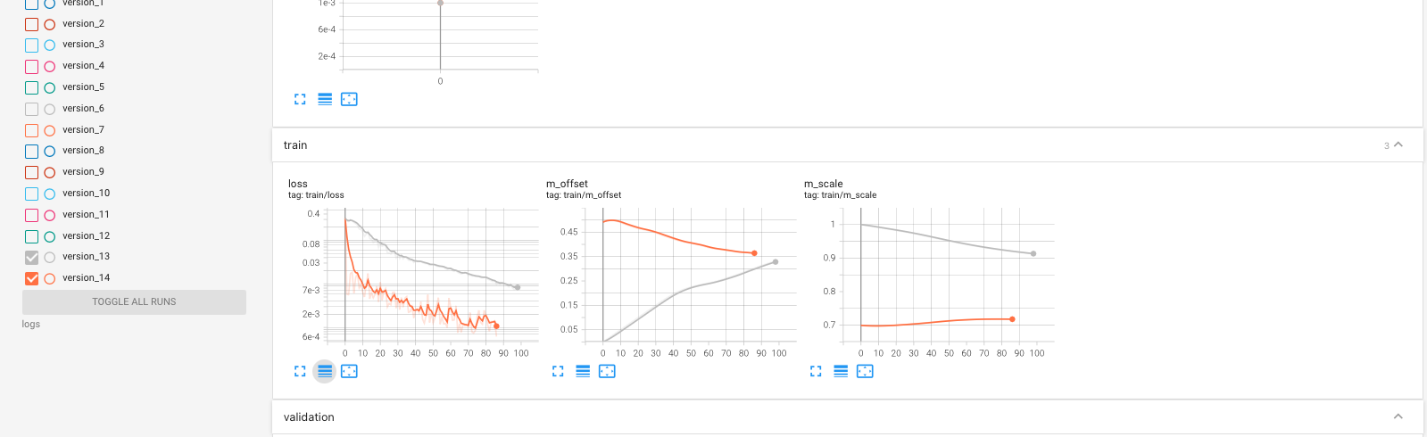 We see the improvement of using analytical scale fitting at the beginning of training (gray without, orange with). Whereas it seems the offset converges to a similar value, the loss decreases much faster
