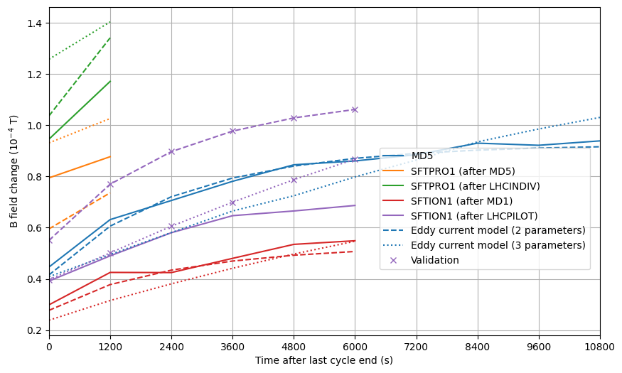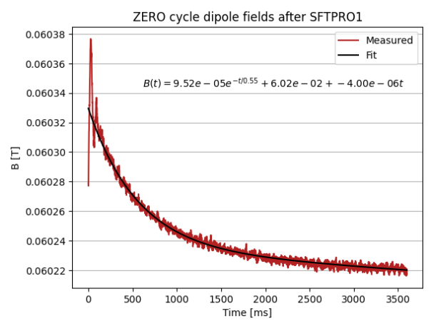 This inconsistency between different measurement systems, and negligible effects on the lab measurements, suggest that the main dipole itself sees few little eddy currents propagating through the magnet yoke, but it is rather an effect on the vacuum chamber, as the SPS B-Train consists of an MBA and an [[SPS Main Dipoles|#MBB]] measured in series, which in turn has 2 vacuum chambers connected together.