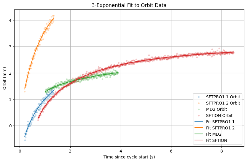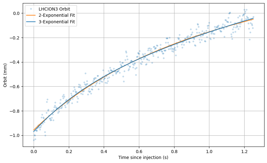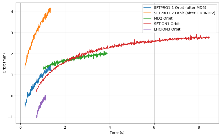 We retrieve the data from the MD2 orbit decay from 2025-03-27 and fit only on the MD2 orbit since we assume is fast decaying. Additionally we retrieve SFTION1 (O4) data from Eddy current measurements 2025-06-27 when the injection plateau was still constant (and also constant RF at injection). We also retrieve data from LHCION3 from 2025-07-02 to use as validation.