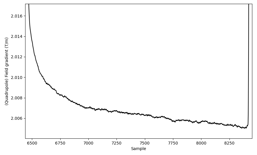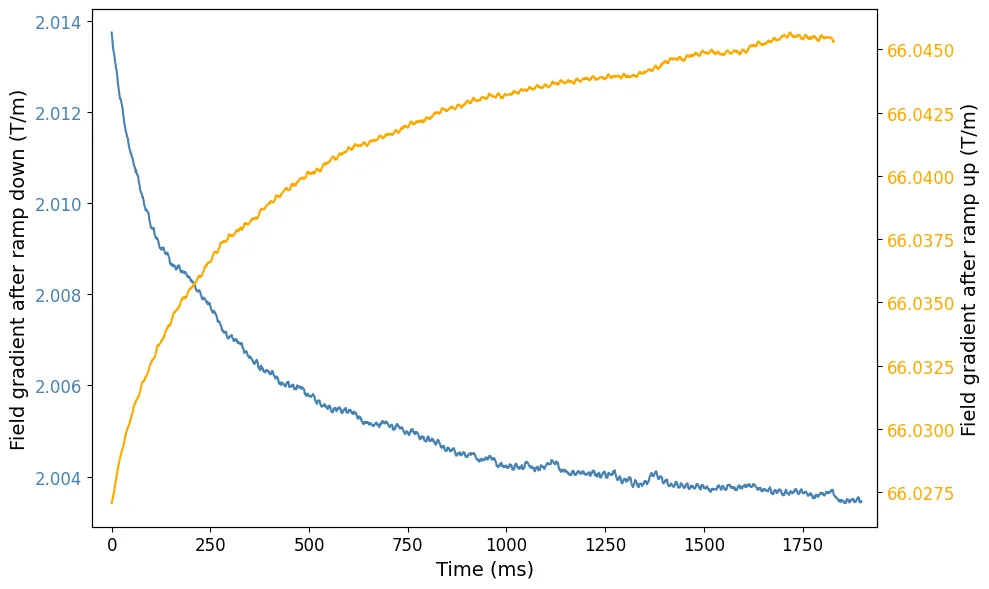 It seems that the decay follows a main ms with a single exponential, and ms and \tau_1\approx 800$ ms decay, which does not match what is measured on the reference quadrupole, with 2-3x larger time constant.
