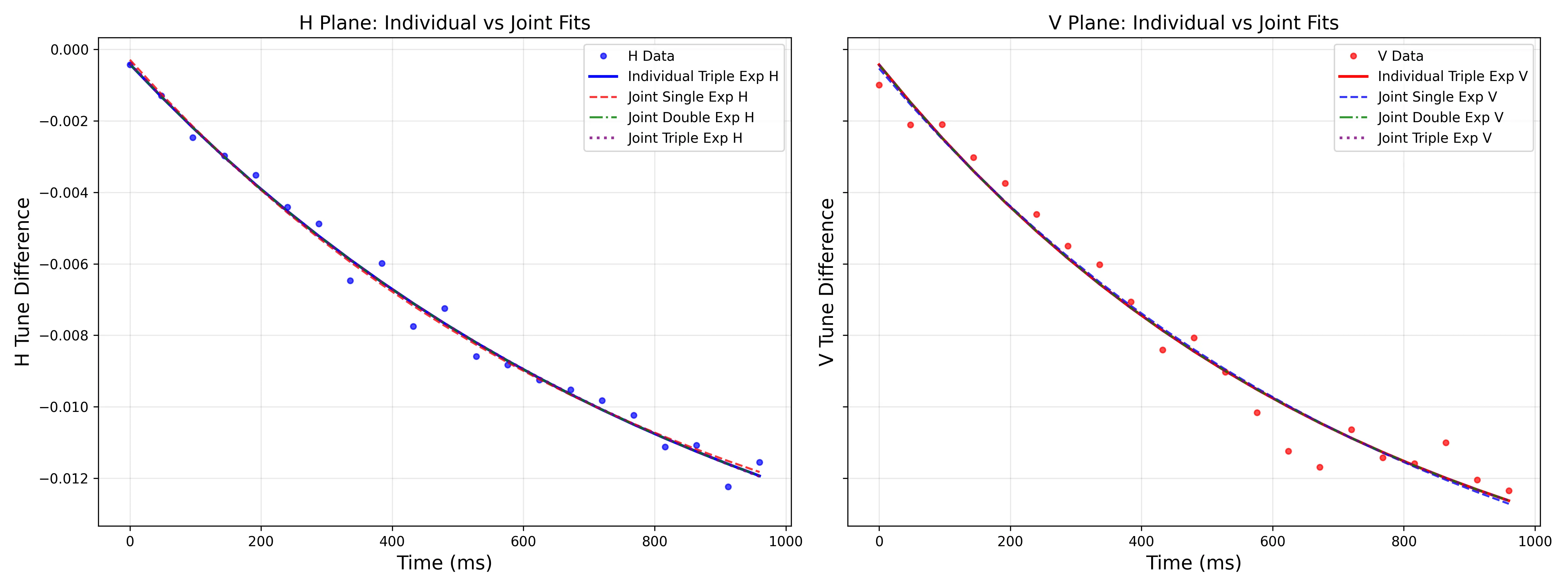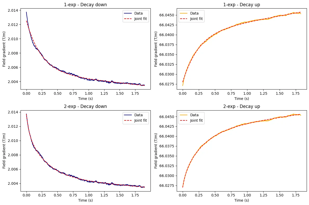 Then we apply joint optimization to optimize the time constants jointly for the two decays, since they describe the same physical system, which yields the following fits: