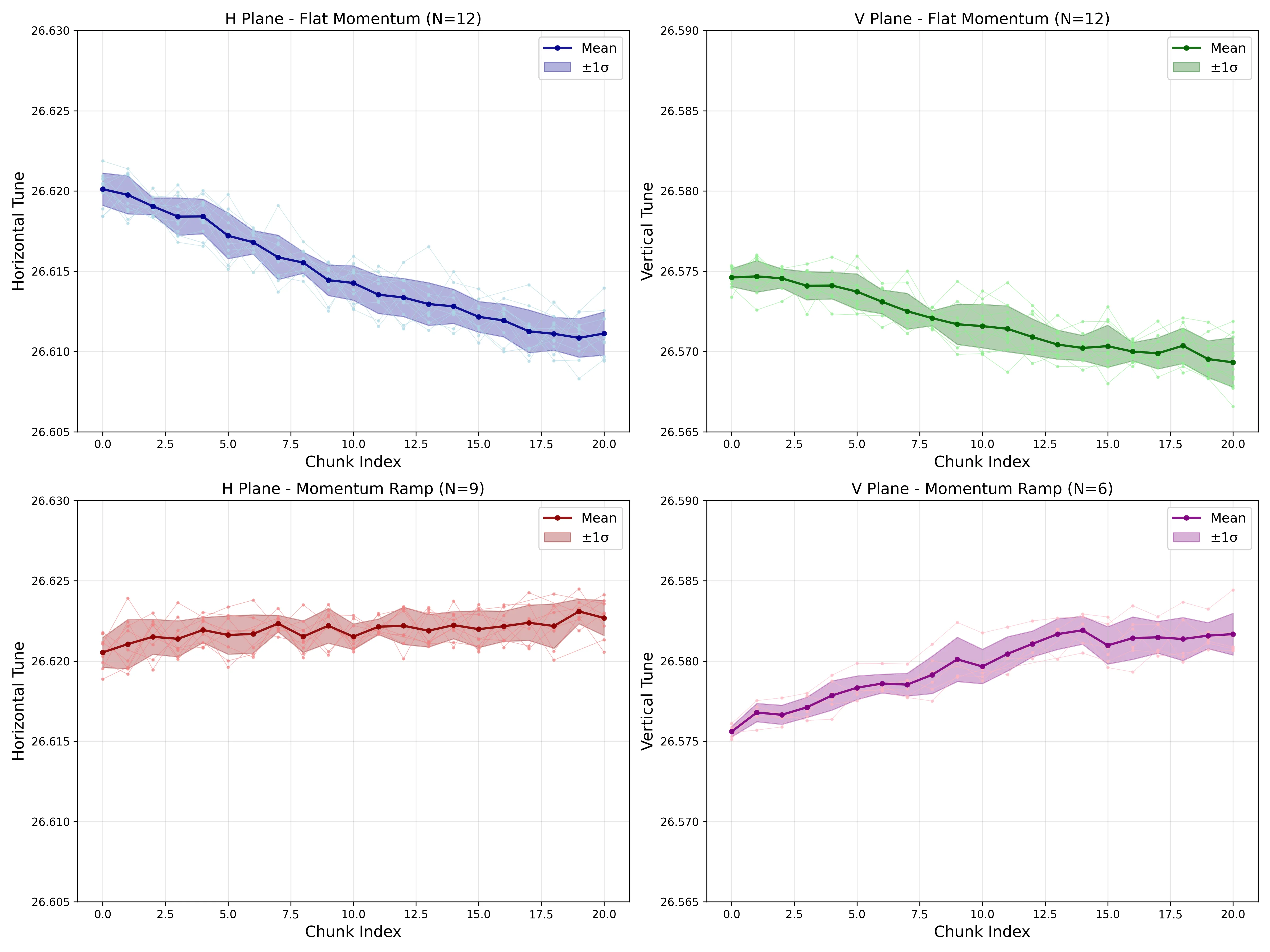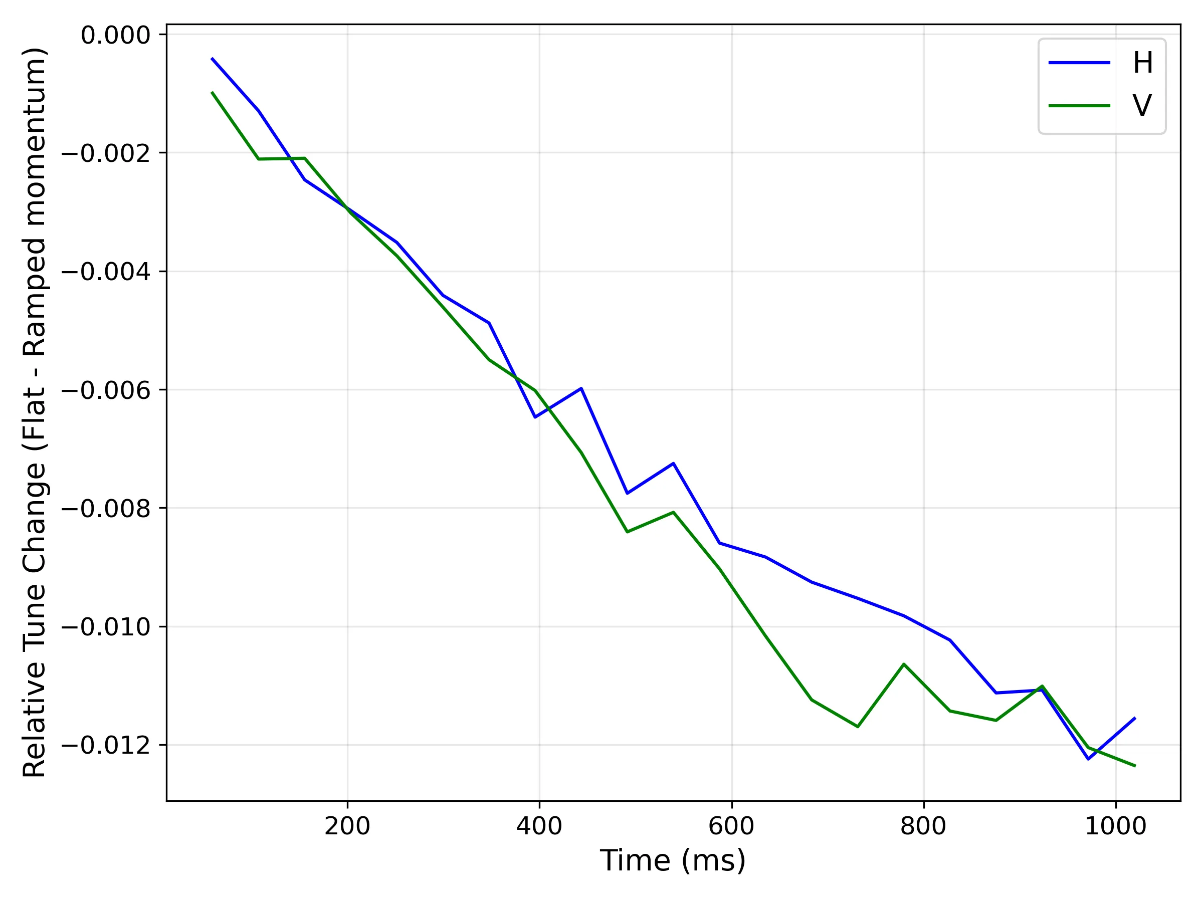 Taking the measured tunes in H and V planes with and without a momentum ramp, we take the pointwise difference to show the relative tune change.