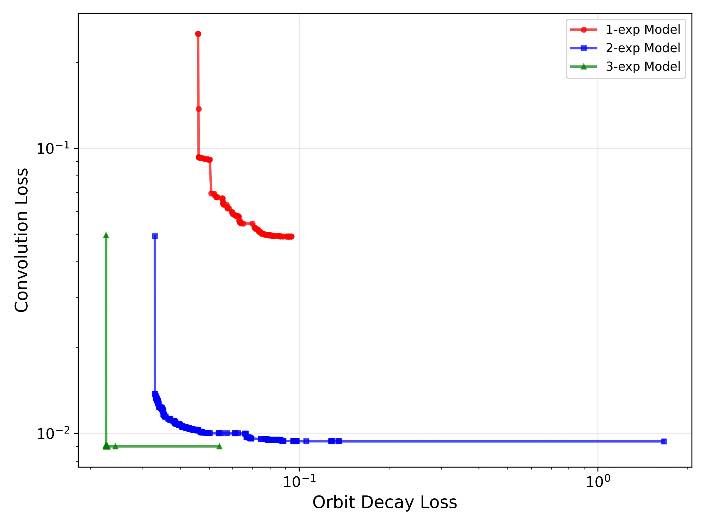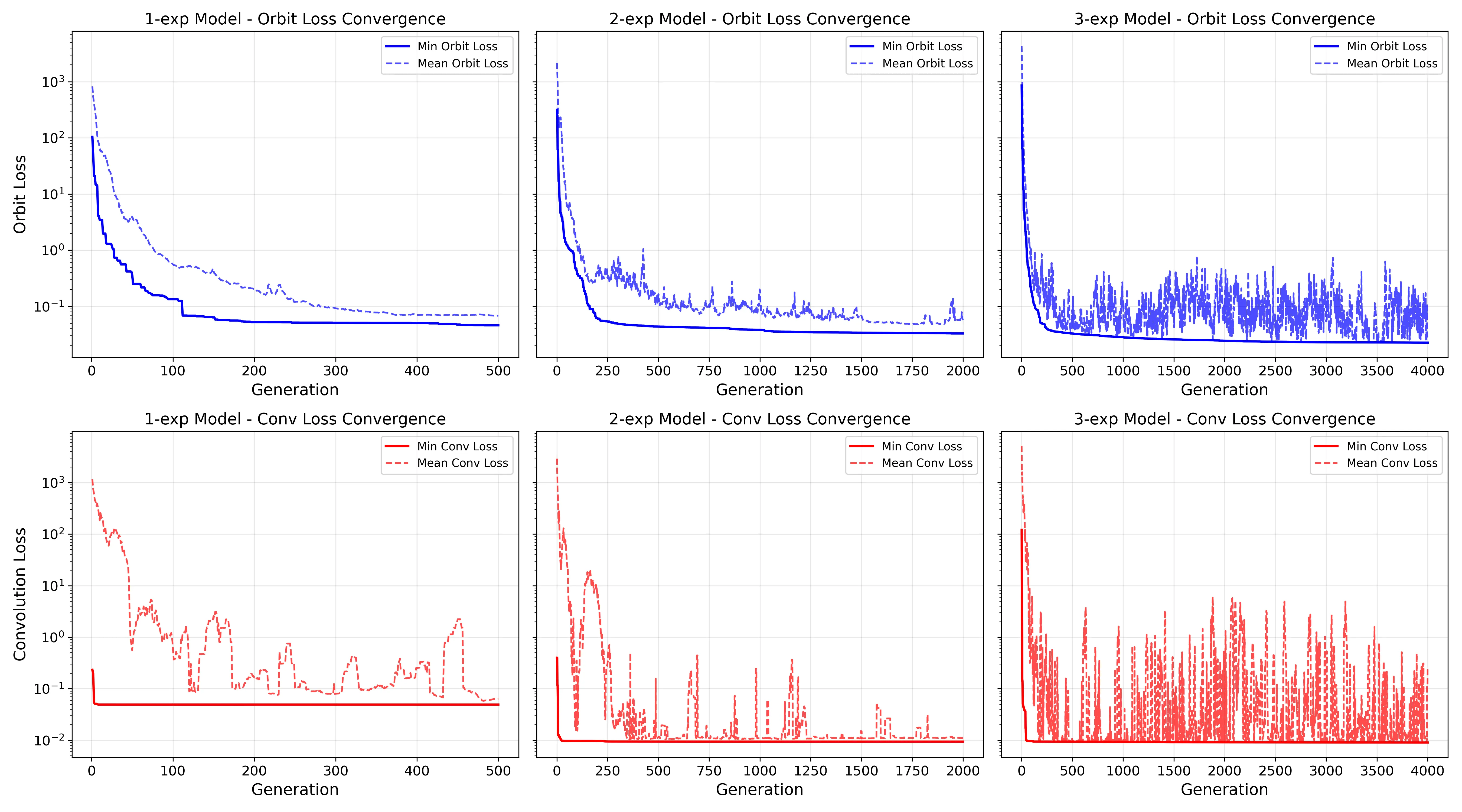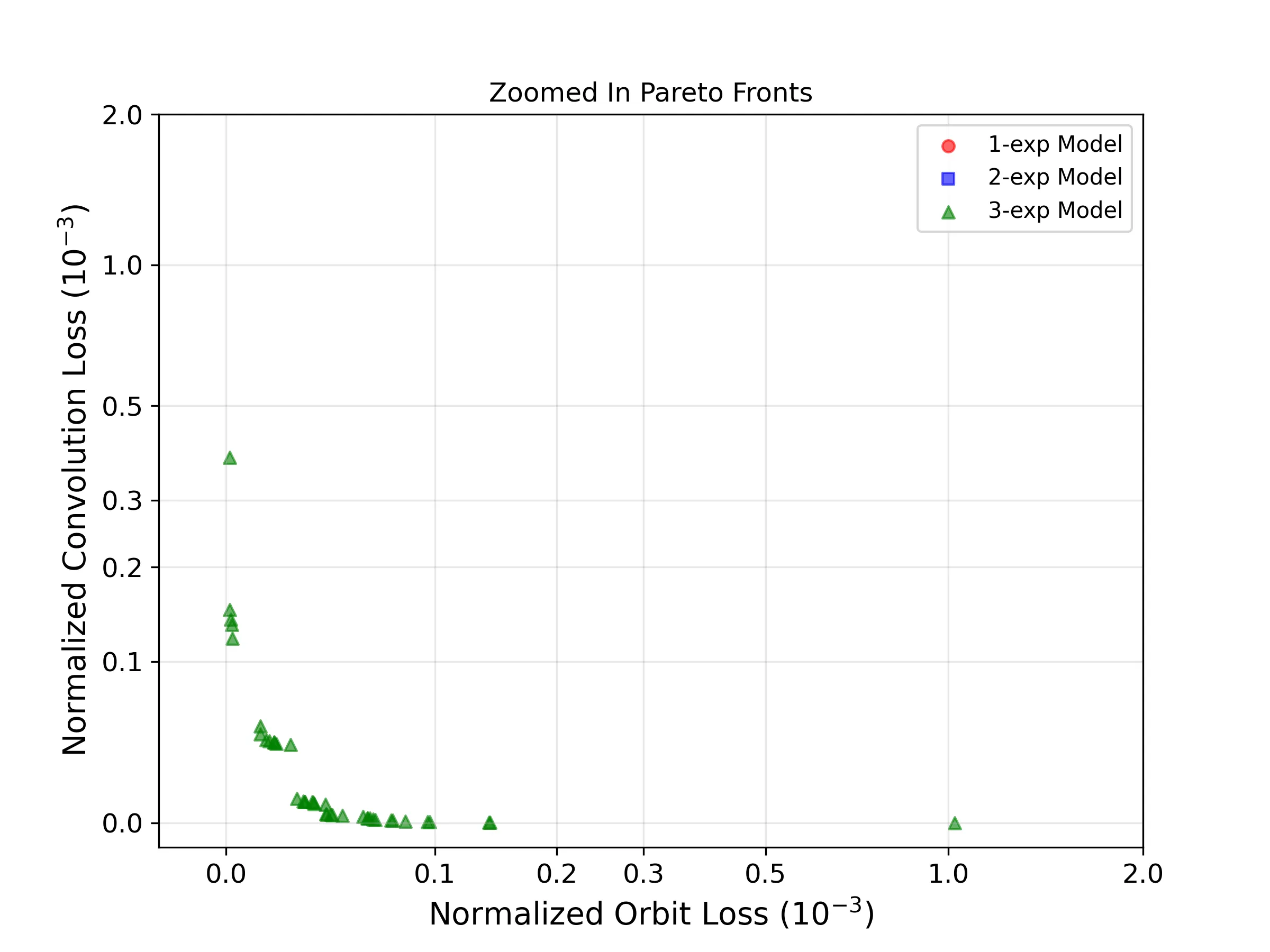 | Model | Population Size | Generations | Pareto Solutions | Pareto Ratio | Min Orbit Loss | Max Orbit Loss | Min Conv Loss | Max Conv Loss |