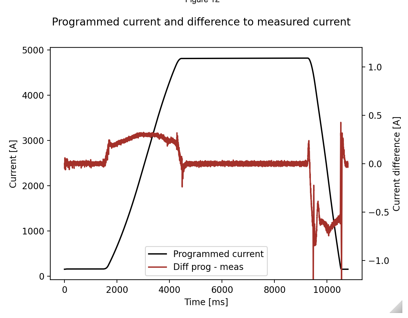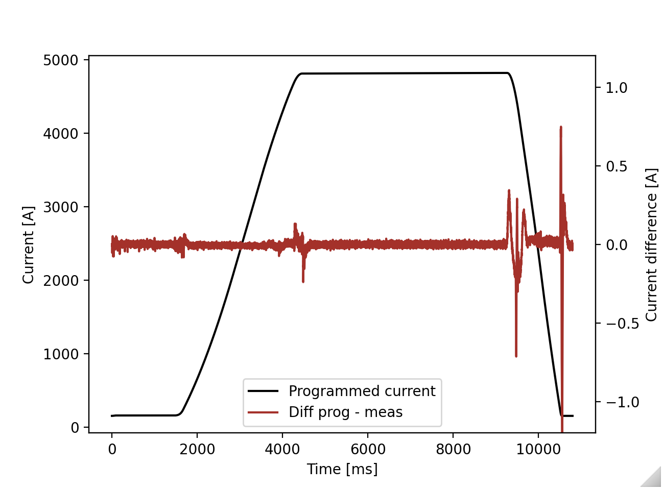 The measured current is ever so slightly delayed after programmed current. Here the during the ramp up, the measured current is about 0.4 A less than the programmed current at each time step during the ramp up.