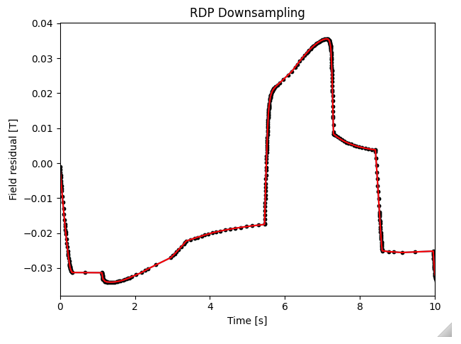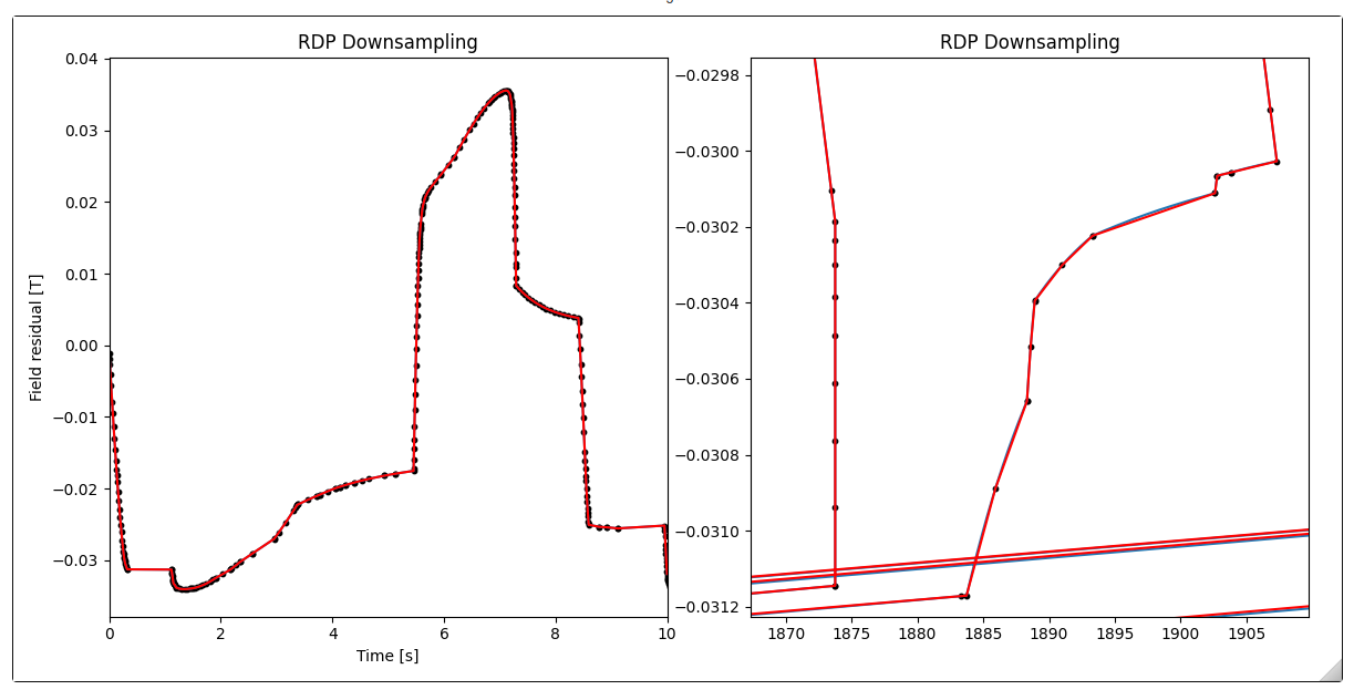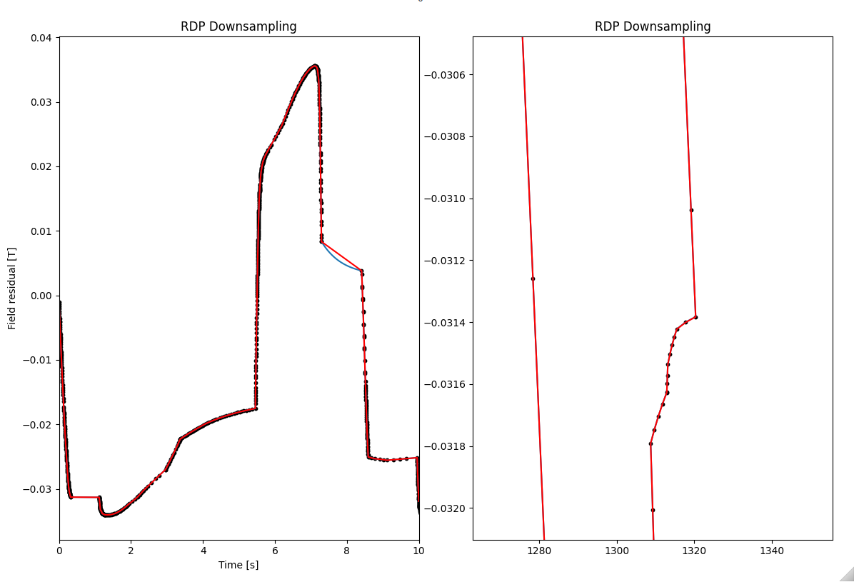 Using the RDP algorithm on the Jiles-Atherton simulated data and , for we can reduce the effective number of points by 95 - 98 %, which is effectively downsampling by 20-50, while still retaining important large changes. Here 2.83 % of all points are kept.