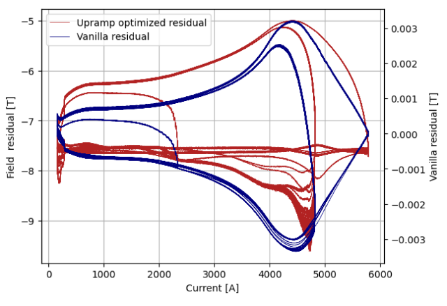In red we see a significantly improved hysteresis separation and dynamic effects on the upramp, with similar numerical range to the downramp.