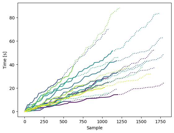 With random sequence length enabled for the encoder, the we can see a spread of time evolutions. Dotted is the decoder input (i.e. prediction axis).