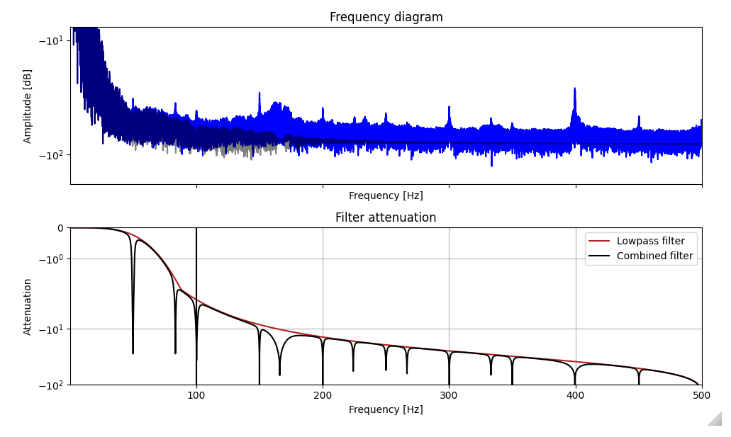 For fixed downsampling rate of 20 (i.e. 50 Hz for original sampling frequency of 1 kHz), we can set the cutoff frequency to the wiki:Nyquist frequency at 25 Hz and do not apply the bandstop filters, since higher frequencies will not be present in the downsampled signal anyways