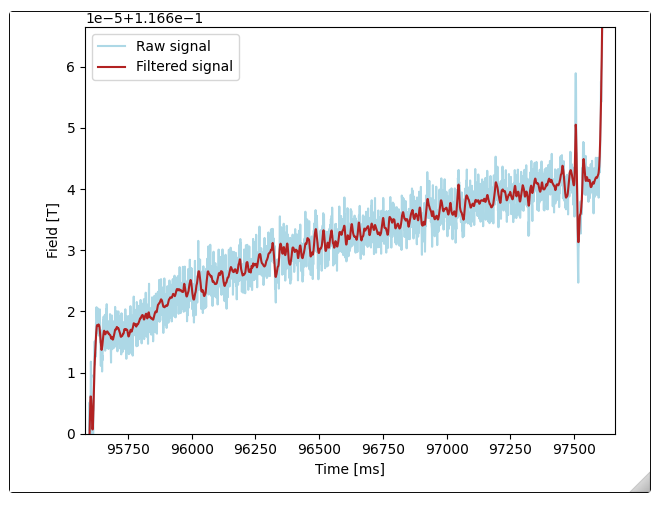 Through attentuating specific frequencies using bandstop frequencies, with peaks detected using scipy peak-detection algorithm, we achieve field measurements with peak-to-peak ripples in the 6e-6 T range