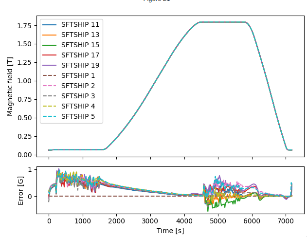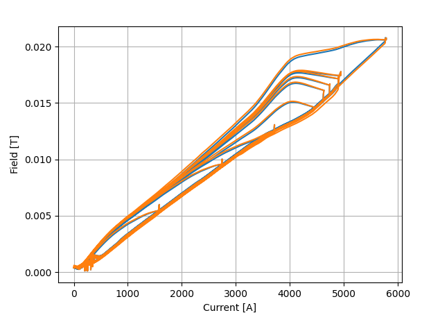 As seen in the figure, significant eddy currents can be seen after ramp down (in the middle in the figure), as well as decay at flat top (to the left), but also some drift is visible (to the right). We could fit data from 867 measurements that show less dynamic effects, however the data is signficantly noisier.