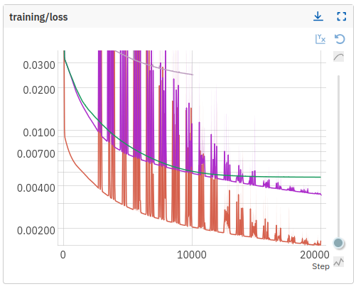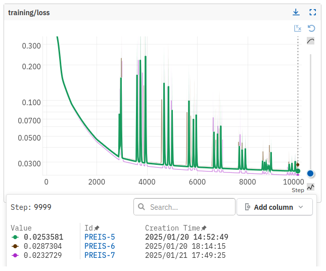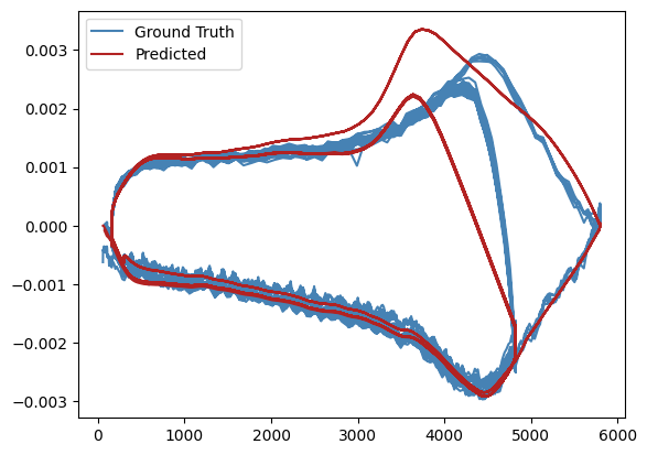 With a downsampling rate of 20 (1 kHz → 50 Hz). Even considering the noise of the data, the model fits rather noise-free hysteresis loops after just 2000 iterations / epochs. Further training of the model overfits with the following plots: