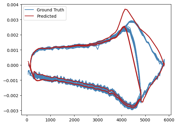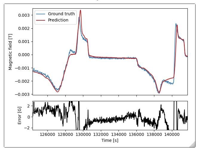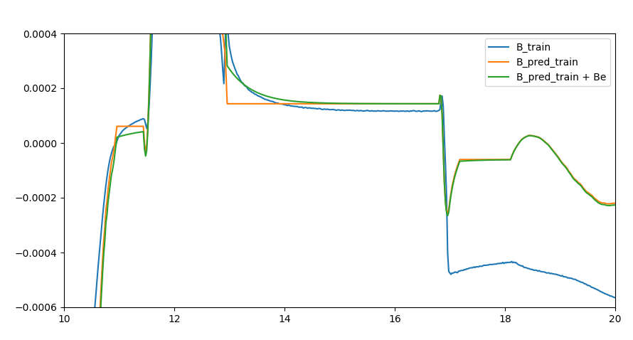 Plotting the predicted fields overlayed (to show some form of hysteresis), with the first field chosen as reference, and cycles 11-19 are nestled between LHCPILOTs (LHC type supercycle), we see that the model is unable to predict the 2 G hysteresis that is supposed to be present during supercycle changes, which might suggest that the model is unable to perfectly fit this behaviour, although input noise in the measured current can certainly account for this effect as well.