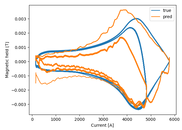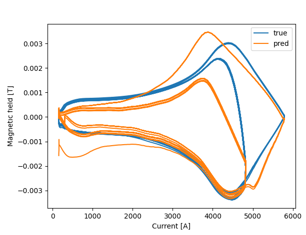 The used Preisach model does not at all consider dynamic effects, whereas this is present in training data due to Eddy current decay. I.e. the field is changing while the current stays constant.