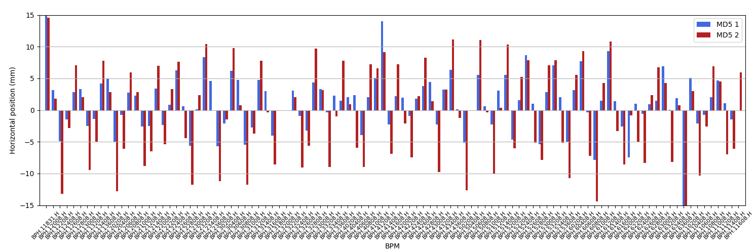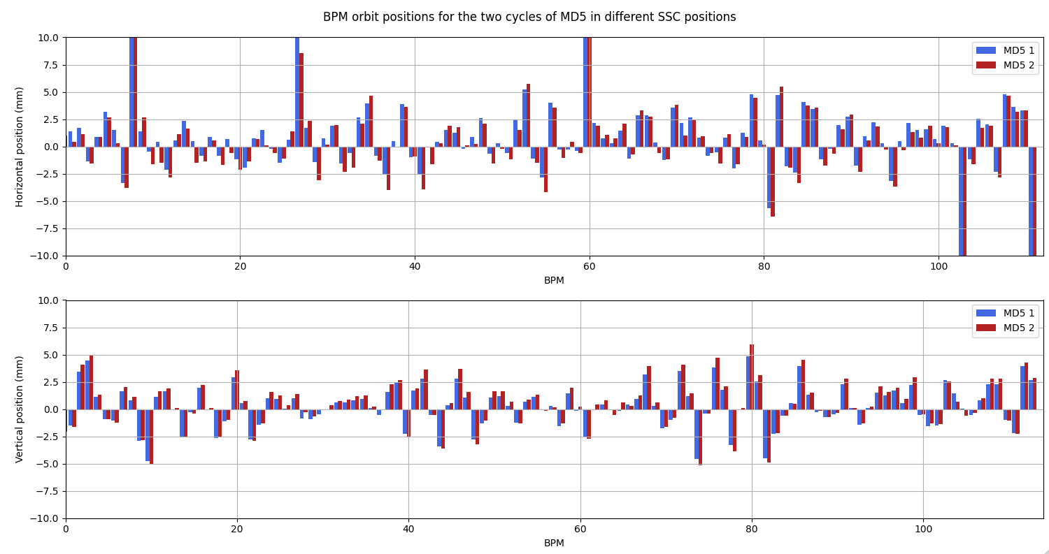 To further analyse the beam orbit positions, we plot the individual BPM values along the ring. There are in total 108 BPMs in the SPS.