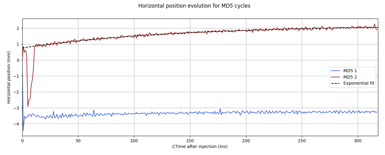 Extracting the positions from all BPMs over time for the 2 MD5 cycles, and fit an exponential to the orbit drift, we see that the movement fits a perfect exponential, with time constant