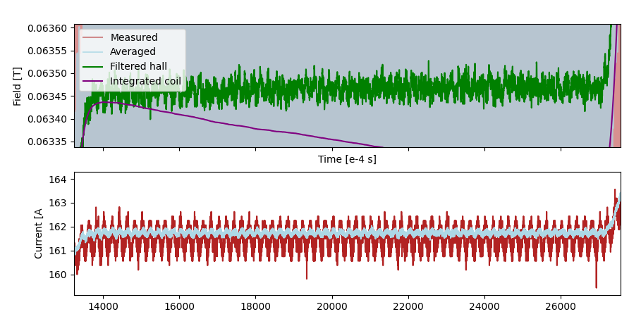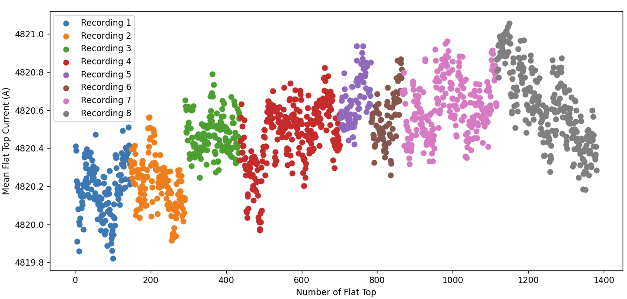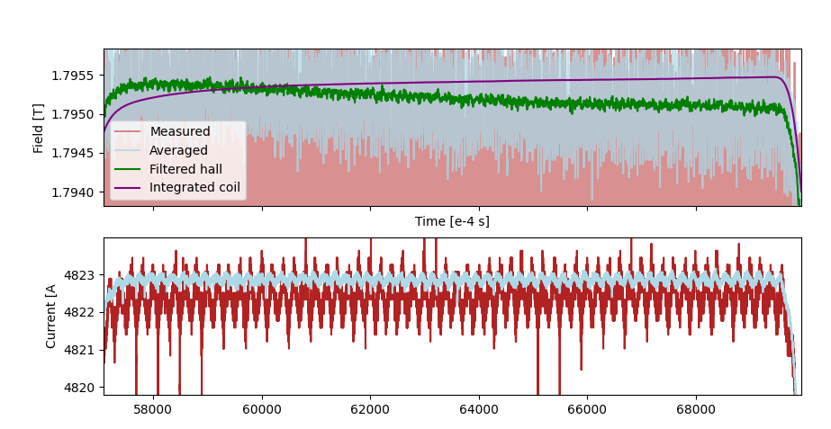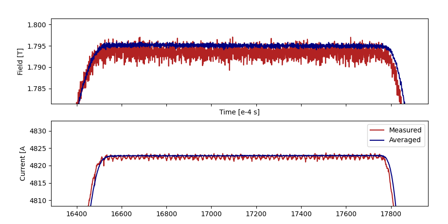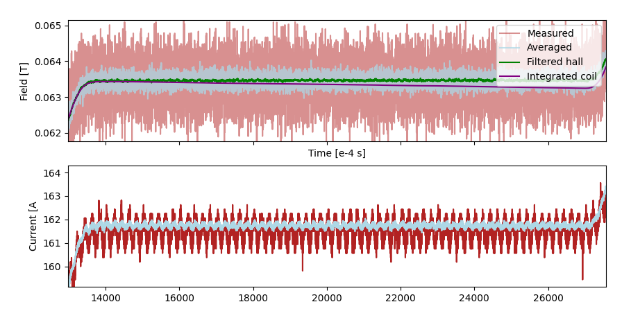 After filtering the measured currents, we can see the measured current amplitude at flat top, which can deviate from the average by up to 0.5 A in either direction, which equates to , which is significantly more than our tolerance.