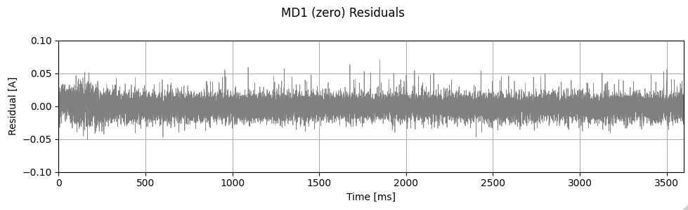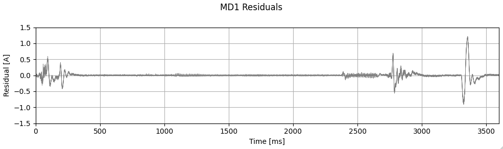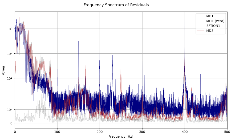 From the frequency spectrum we see that they are largey similar, and the lack of lower frequency components from the MD1 (zero) is likely due to the lack of ramping for that signal.