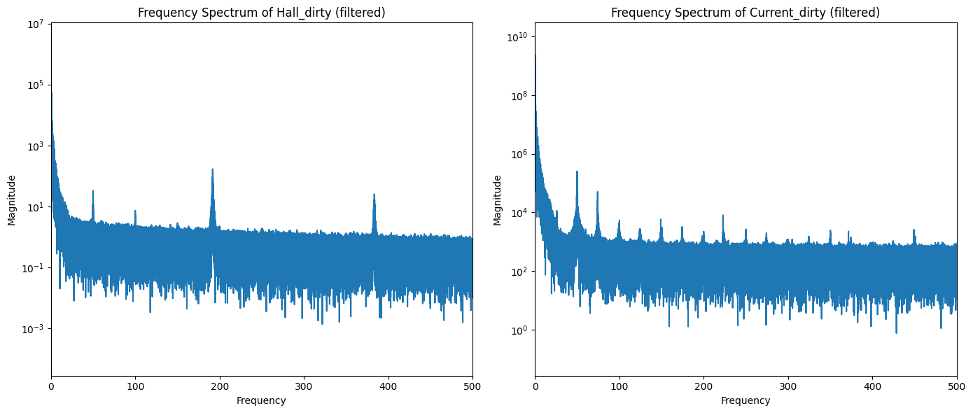The frequency spectrum clearly shows the 50 Hz harmonics in the measured current. Here the data i is filtered with a median filter with kernel size 201. In the measured current one can see additional frequency harmonics in the power supply, many of which are filtered out when looking at the field response.