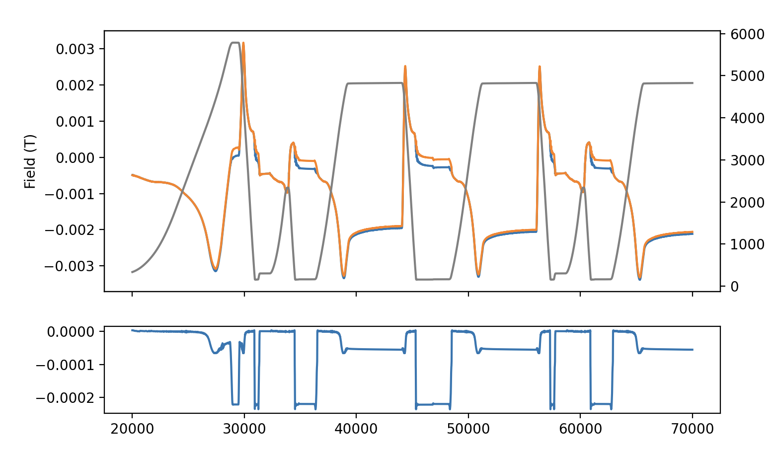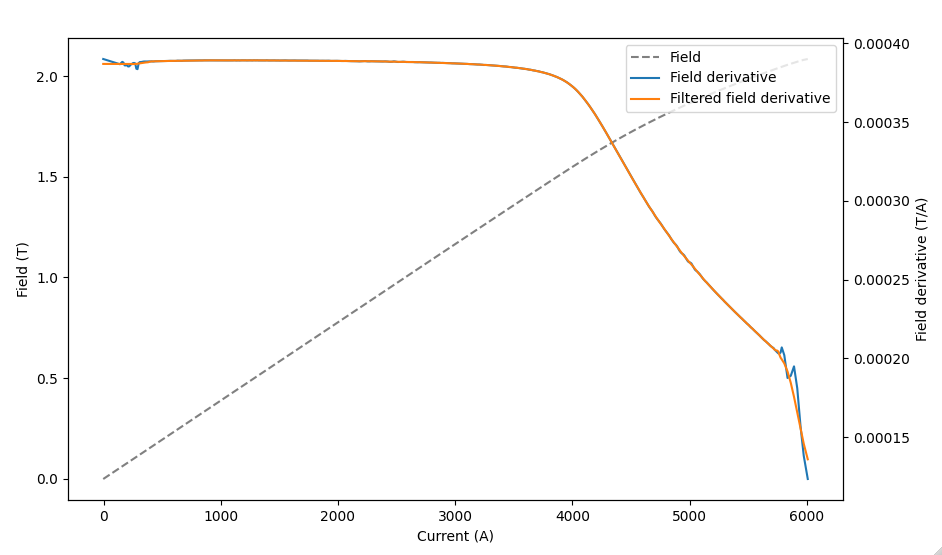 The piecewise linear function from Fit piecewise-linear fn to I-B v4 shows artifacts on low and high currents. At low fields it is not a good fit due field measurement uncertainties from drift.