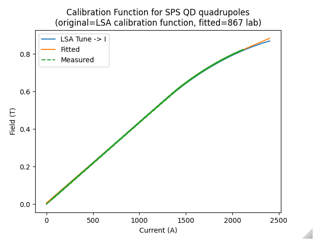 Compared to the Tune to I function (multiplied by a factor 0.0376 for scaling tune to approximate field) we see a clear difference between the fitted and the measured. In both cases the max current goes outside of of the domain of the measurements.