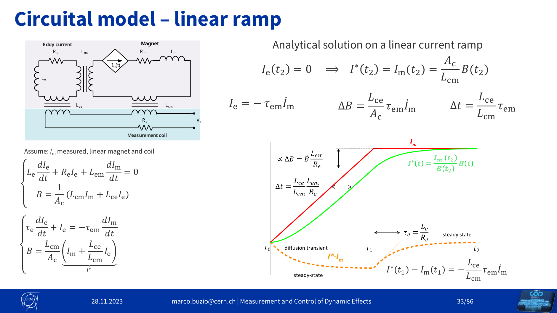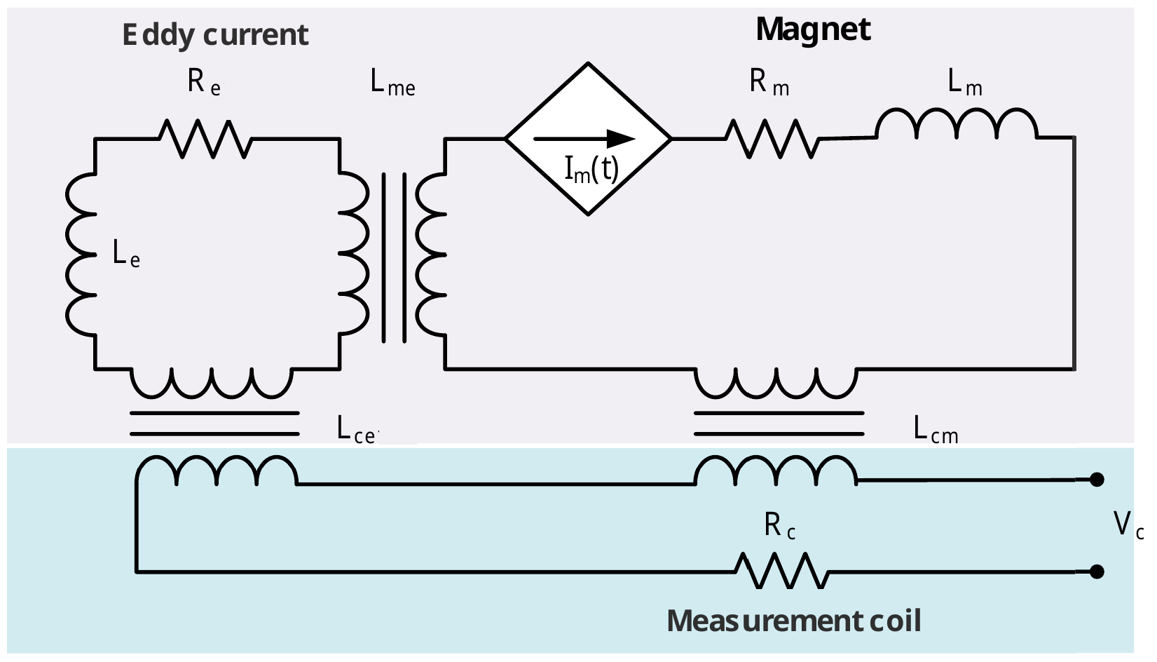 Assuming the circuit in the figure, where is the measured magnetization current, here with a linear magnet and coil. is the inductance of the magnet, the mutual inductance between the eddy currents and the magnet circuit, the inductance of the eddy currents, the mutual inductance between the measurement coil and the eddy currents, and the mutual inductance between the measurement coil and the magnet. The eddy current relationship can be described as